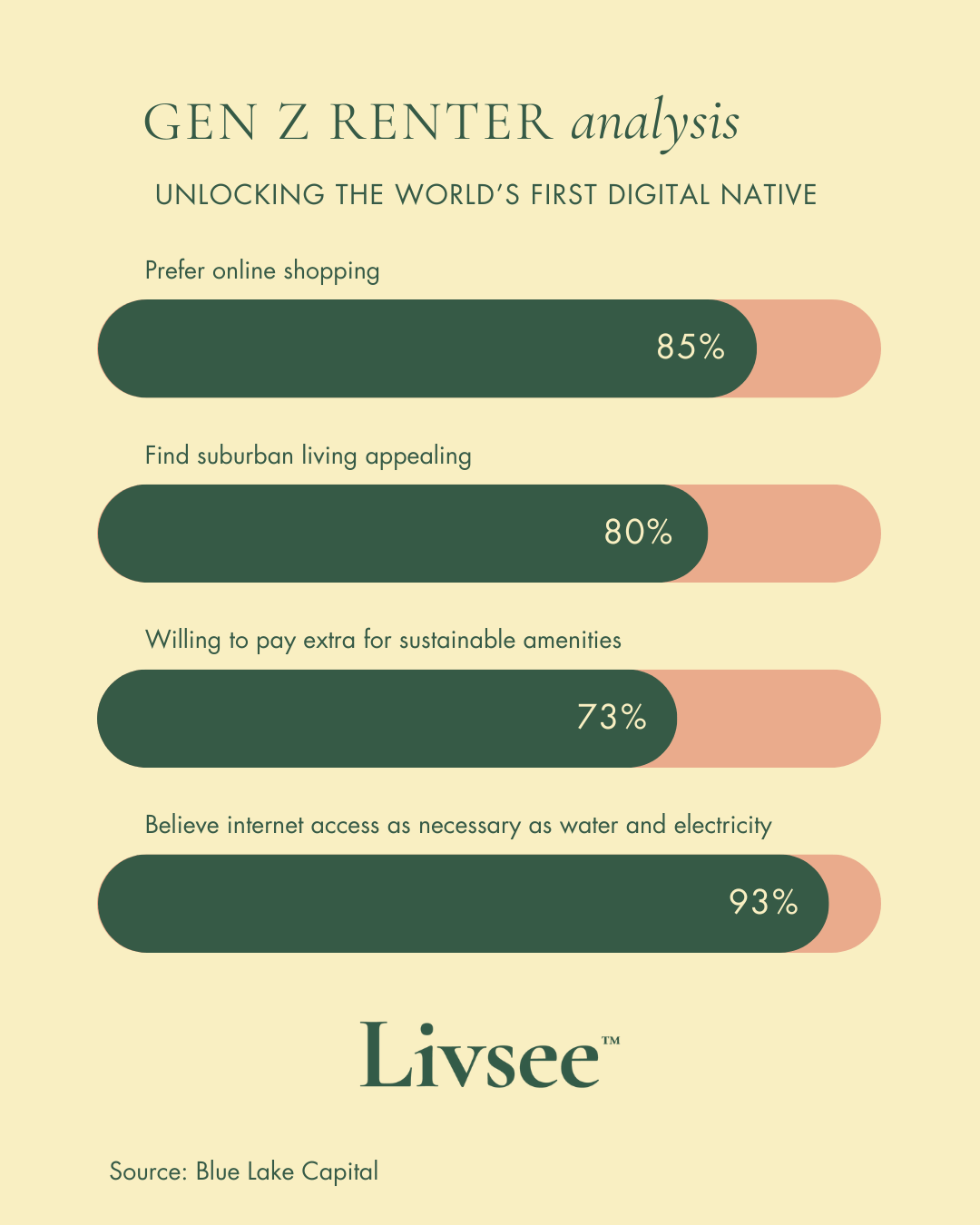 Despite being the most dedicated savers (Newsweek), Gen Z remains concerned about affordability. Renting is an attractive option as their incomes struggle to keep pace with rising home prices (arbor.com). They have an interest in suburban living (Statista) and prioritize sustainabilityāso much so that theyāre willing to pay more for eco-friendly options (First Insight). Among their highest priorities is connectivity and internet access (thred.com)