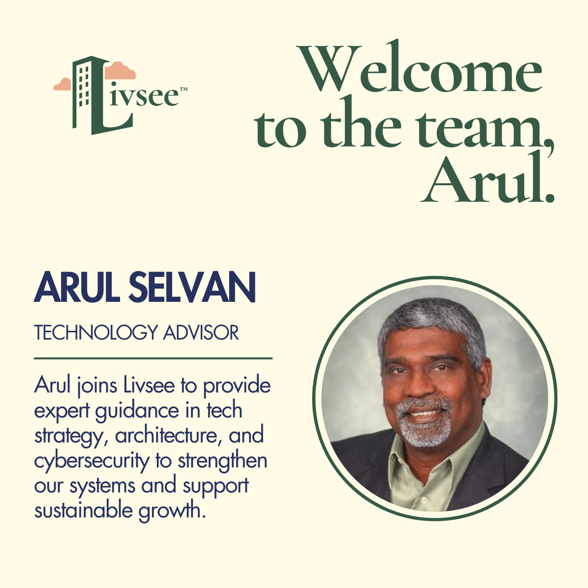 Weāre excited to officially welcome Technology Advisor Arul Selvan to the Livsee⢠team. Arul brings decades of experience leading technology, cybersecurity, and innovation efforts, with a focus on scalable systems in the multifamily space. His leadership at companies like RealPage and his deep technical acumen make him a powerful strategic partner as we continue to build and refine our platform.